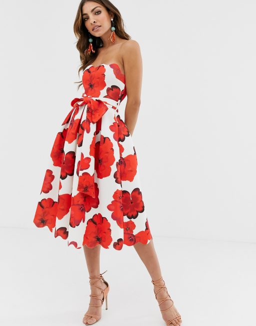 Asos design poppy printed bandeau midi dress with ruffle pep hem.